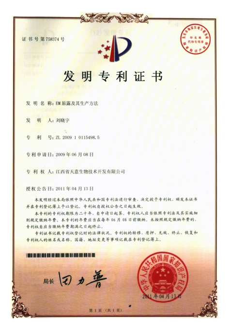 2000年,天意企業(yè)獲得高新技術(shù)企業(yè)稱號(hào),之后每隔三年直至今天均連續(xù)獲得國(guó)家高新技術(shù)企業(yè)稱號(hào)。同年,EM原露獲得省科技廳頒發(fā)的“優(yōu)秀新產(chǎn)品”證書。